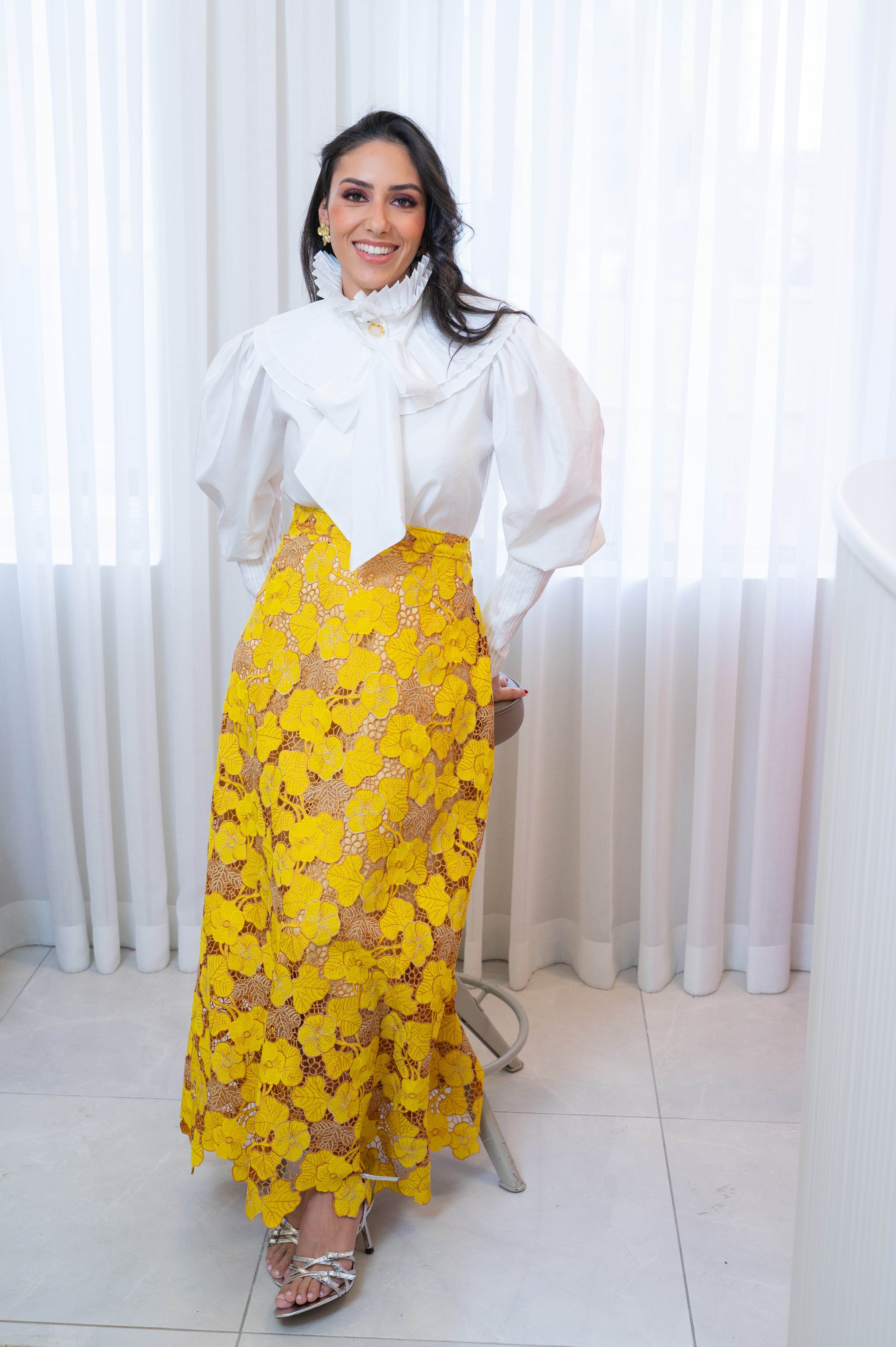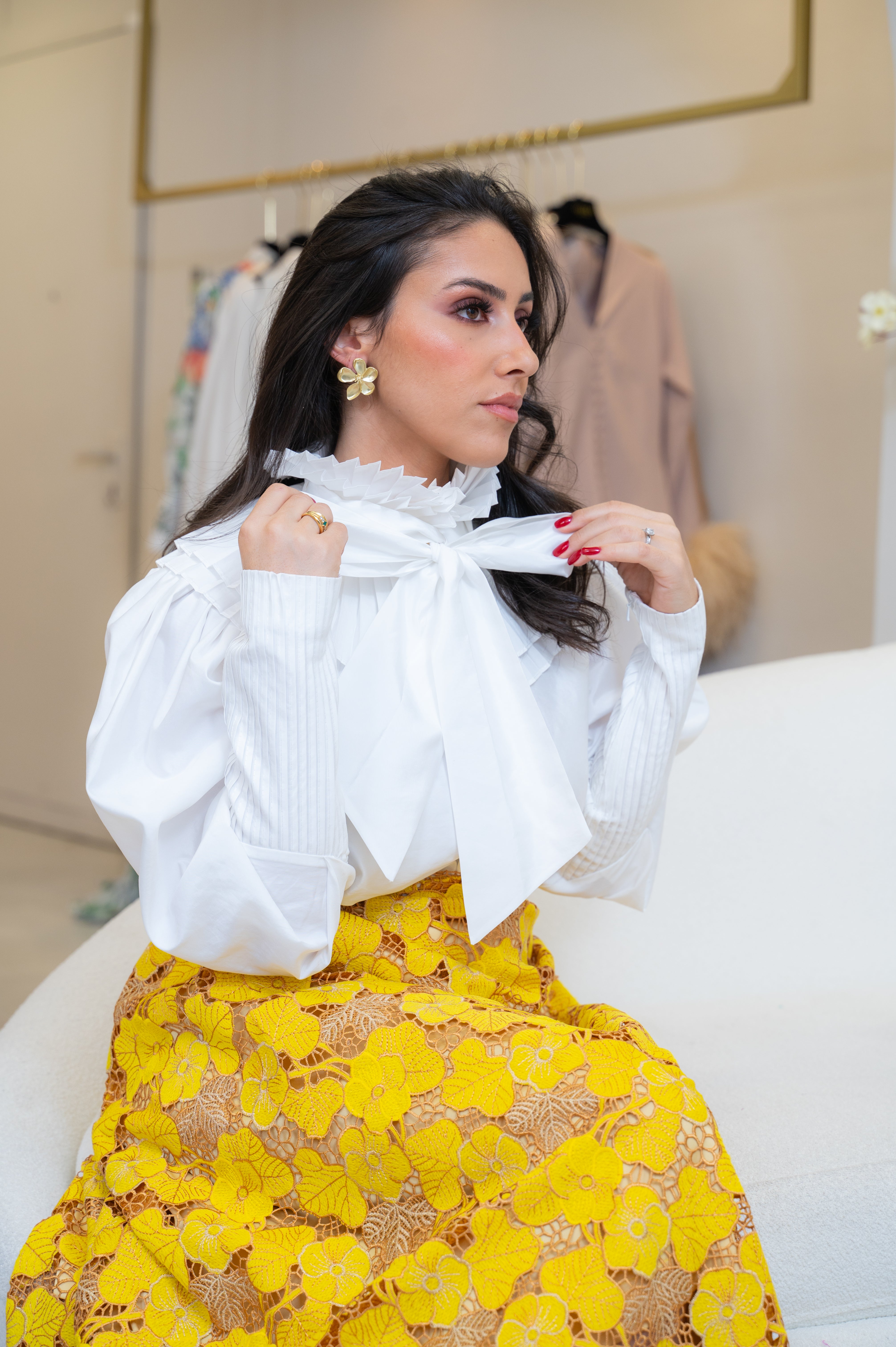Jupe crochet fleurie en relief avec cette chemise plissée à col montant